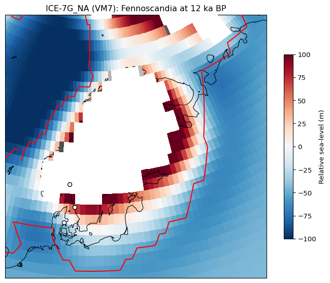 And here we have the resulting map showing RSL at 12 ka BP, areas covered by ice indicated in white, the outline of the ice cover at the Last Glacial Maximum (LGM) given in red, and the location of Oslo, Göteborg and Aarhus as points. We’ll now use the coordinates for the points to find RSL change over time at these locations.