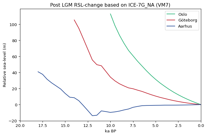# Retrieve the data for the point representing Göteborg, using nearest neighbour# to interpolate the values to this point.point_gbg = ds.sel(lat = gbg_lat, lon = gbg_lon, method ="nearest")# Retrieve the RSL values by flipping the Topo_Diff sign and exclude periods when# Göteborg was covered by icersl_gbg =-point_gbg["Topo_Diff"].where(point_gbg["stgit"] ==0)# Transform this into a pandas series amenable for plottingrsl_gbg_ts = rsl_gbg.to_series()# Repeat for Oslopoint_osl = ds.sel(lat = osl_lat, lon = osl_lon, method ="nearest")rsl_osl =-point_osl["Topo_Diff"].where(point_osl["stgit"] ==0)rsl_osl_ts = rsl_osl.to_series()# Repeat for Aarhuspoint_aar = ds.sel(lat = aar_lat, lon = aar_lon, method ="nearest")rsl_aar =-point_aar["Topo_Diff"].where(point_aar["stgit"] ==0)rsl_aar_ts = rsl_aar.to_series()# Call to plotplt.figure(figsize=(8,5))plt.plot(point_osl["time"], rsl_osl_ts, color ='#27b376', label ='Oslo')plt.plot(point_gbg["time"], rsl_gbg_ts, color ='#bf212f', label ='Göteborg')plt.plot(point_osl["time"], rsl_aar_ts, color ='#264b96', label ='Aarhus')plt.legend()plt.xlabel("ka BP")plt.ylabel("Relative sea-level (m)")plt.title("Post LGM RSL-change based on ICE-7G_NA (VM7)")plt.gca().invert_xaxis() plt.xlim(20, 0);