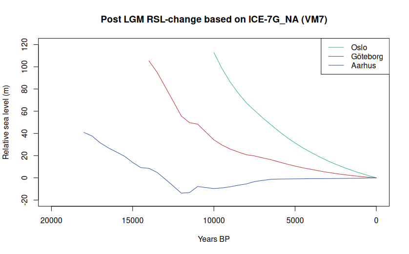 # Uncomment the lines below to install the packages used in the script# install.packages("terra")# install.packages("stringr")# install.packages("here")library(terra) # For handling NetCDF files and spatial datalibrary(stringr) # For wokring with strings when loading fileslibrary(here) # For file paths relative to the directory where the R script is located# Replace file path to where you have stored the NetCDF filesfiles <-list.files(path = here("../ICE-7G_NA(VM7)"), pattern ="\\.nc$", full.names = TRUE)# Get the age of the time-slice of each fileages_kBP <-as.numeric(str_extract(files, "(?<=1deg\\.)[0-9]+(\\.[0-9]+)?"))# Order the list of file names based on thisfiles_sorted <- files[order(ages_kBP, decreasing = TRUE)]# And get the sorted numbers to assign to a time dimension of the rasters in the stack.# Using the full age BP instead of ka BP, due to how terra handles the time dimensionages_kBP <- sort(ages_kBP, decreasing = TRUE) *1000# Read in the rasters as a stack and rotate() to change longitude convention from# going from 0 to 260 to -180 to 180topodiff_stack <- rotate(rast(files_sorted, subds ="Topo_Diff"))ice_stack <- rotate(rast(files_sorted, subds ="stgit"))# Assign ages to the stackstime(topodiff_stack) <- ages_kBPtime(ice_stack) <- ages_kBP# Retrieve RSL and ice cover at 12 ka BP for ploti_12ka <- which.min(abs(time(topodiff_stack) -12000))# RSL at 12 ka BPrsl_12ka <--topodiff_stack[[i_12ka]]# Ice cover at 12 ka BP, set to NA where ice is not presentice_12ka <- ice_stack[[i_12ka]]ice_12ka[ice_12ka <=0] <- NA# Point vector features for Oslo, Göteborg and Aarhusosl <- vect(data.frame(lon =10.75, lat =59.90), geom = c("lon", "lat"), crs ="EPSG:4326")gbg <- vect(data.frame(lon =11.97, lat =57.70), geom = c("lon", "lat"), crs ="EPSG:4326")aar <- vect(data.frame(lon =10.20, lat =56.14), geom = c("lon", "lat"), crs ="EPSG:4326")# Simple map plot for a sanity check (not reproduced here)plot(rsl_12ka, main ="ICE-7G_NA (VM7): RSL and ice cover at 12 ka BP")plot(ice_12ka, col ="white", legend = FALSE, add = TRUE)plot(osl, cex =0.5, add = TRUE)plot(gbg, cex =0.5, add = TRUE)plot(aar, cex =0.5, add = TRUE)# Flip sign of Topo_Diff and extract this for Oslo.# Remove the ID associated with the values using [1, -1]rsl_osl <- extract(-topodiff_stack, osl)[1, -1]# Extract ice cover for Osloice_osl <- extract(ice_stack, osl)[1, -1]# Remove RSL for when Oslo was covered by ice, as this is undefinedrsl_osl <-as.numeric(ifelse(ice_osl >0, NA, rsl_osl))# Repeat for Göteborgrsl_gbg <- extract(-topodiff_stack, gbg)[1, -1]ice_gbg <- extract(ice_stack, gbg)[1, -1]rsl_gbg <-as.numeric(ifelse(ice_gbg >0, NA, rsl_gbg))# Repeat for Aarhusrsl_aar <- extract(-topodiff_stack, aar)[1, -1]ice_aar <- extract(ice_stack, aar)[1, -1]rsl_aar <-as.numeric(ifelse(ice_aar >0, NA, rsl_aar))# Create data frames for plottingrsl_osl <- data.frame(BP = time(topodiff_stack), rsl = rsl_osl)rsl_gbg <- data.frame(BP = time(topodiff_stack), rsl = rsl_gbg)rsl_aar <- data.frame(BP = time(topodiff_stack), rsl = rsl_aar)# Call to plotplot(rsl_osl$BP, rsl_osl$rsl, type="n", xlim = c(20000, 0), ylim = c(-20, 120), xlab ="Years BP", ylab ="Relative sea level (m)", main ="Post LGM RSL-change based on ICE-7G_NA (VM7)")lines(rsl_osl$BP, rsl_osl$rsl, type="l", col ="#27b376")lines(rsl_gbg$BP, rsl_gbg$rsl, type="l", col ="#bf212f")lines(rsl_aar$BP, rsl_aar$rsl, type="l", col ="#264b96")legend("topright", legend = c("Oslo", "Göteborg", "Aarhus"), col = c("#27b376", "#bf212f", "#264b96"), lty =1)